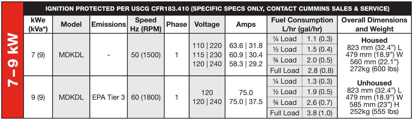 Cooling System – Freshwater cooling system with heat exchanger, expansion tank and coolant recovery system. Coolant overflow bottle to easily maintain coolant level. Coolant capacity of 4L (4.2 qt). Coolant flow rate of 15.9L/min (4.2 gal/min) for 50Hz ratings and 18.9L/min (5.0 gal/min) for 60Hz ratings